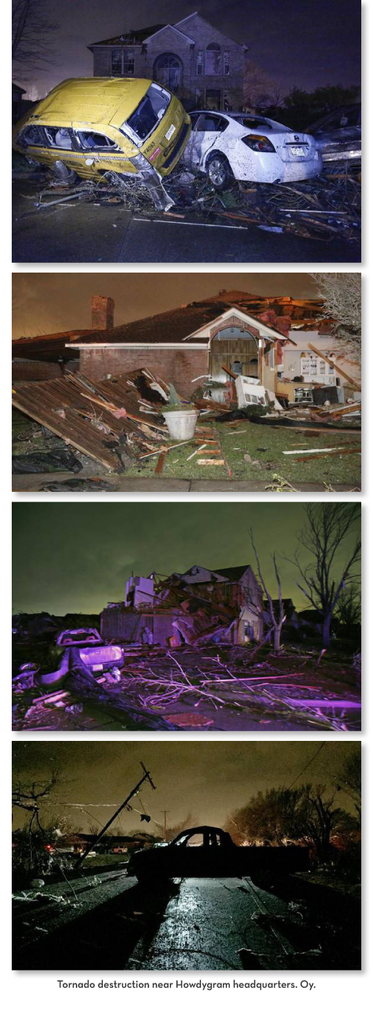 Here’s a handy map that illustrates the path of the EF-4 Garland/Rowlett tornado — with a wind speed of 200 m.p.h. that was DANGEROUSLY CLOSE TO YOUR FAVORITE BLOGGER (i.e., me) — followed by a few pictures of storm damage from the Dallas Morning News’ website. The asterisk on the map indicates Howdygram headquarters; the red circles show the path of the tornado. There are 11 confirmed fatalities so far. Some people are still missing; I’m guessing they’re in Oz.